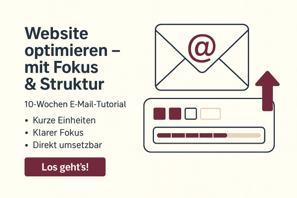 Dann begleite ich dich in meinem 10-Wochen-E-Mail-Tutorial für 0€ „Website-Optimierung – mit Fokus und Struktur“: Kompakte Tipps rund um SEO, Technik & Content – direkt umsetzbar, klar erklärt und praxisnah.
